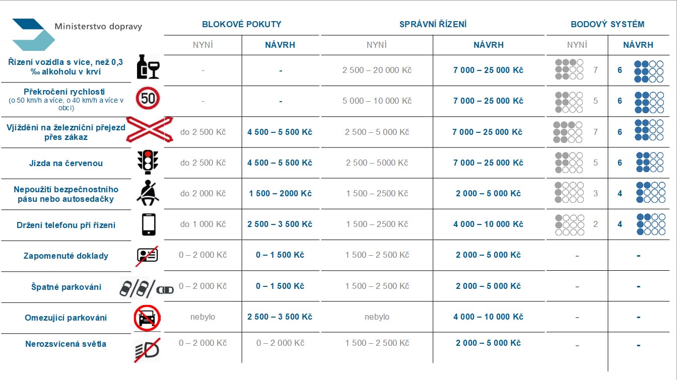 Novela zavádí nově pouze tři sazby bodů podle závažnosti, a to 6, 4 a 2 body, oproti nynějším pěti různým sazbám. U závažných přestupků se zvyšují sazby blokových pokut na místě, které už nebudou moci být jen symbolické. Ve správním řízení se zvyšují horní hranice sazeb pokut, tak aby bylo možné přihlédnout k vysoce nebezpečnému chování v silničním provozu. U závažných přestupků se prodlužuje i délka doby, po kterou řidič nesmí řídit.