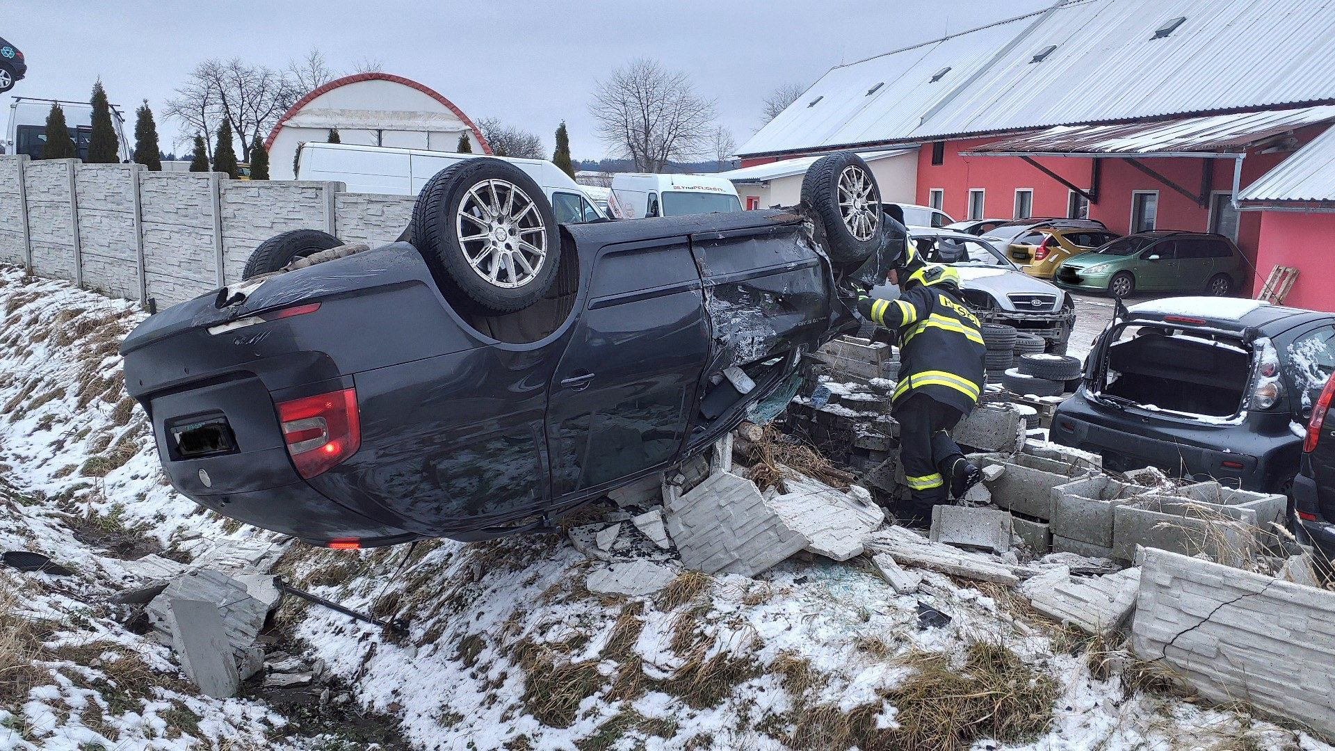 Tohle ještě na autovrakovišti ve Vrbatově Kostelci na Chrudimsku nezažili. Tedy, aby k nim auto přijelo samo, nebo spíše přiletělo. Řidič tmavě modré Škody Octavia RS tam v sobotu kolem 13. hodiny vyjel ze silnice, převrátil auto na střechu a zbořil přitom betonový plot.