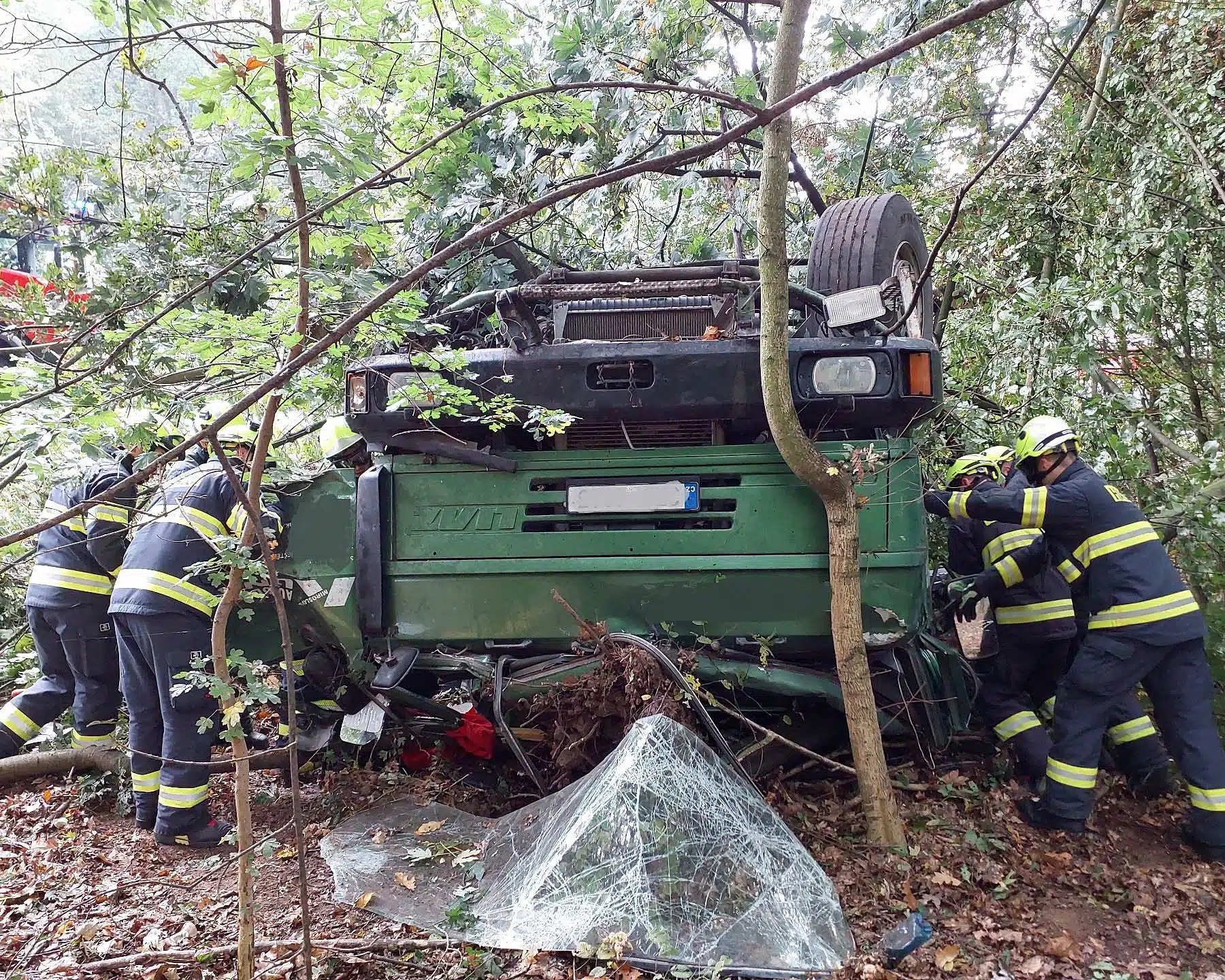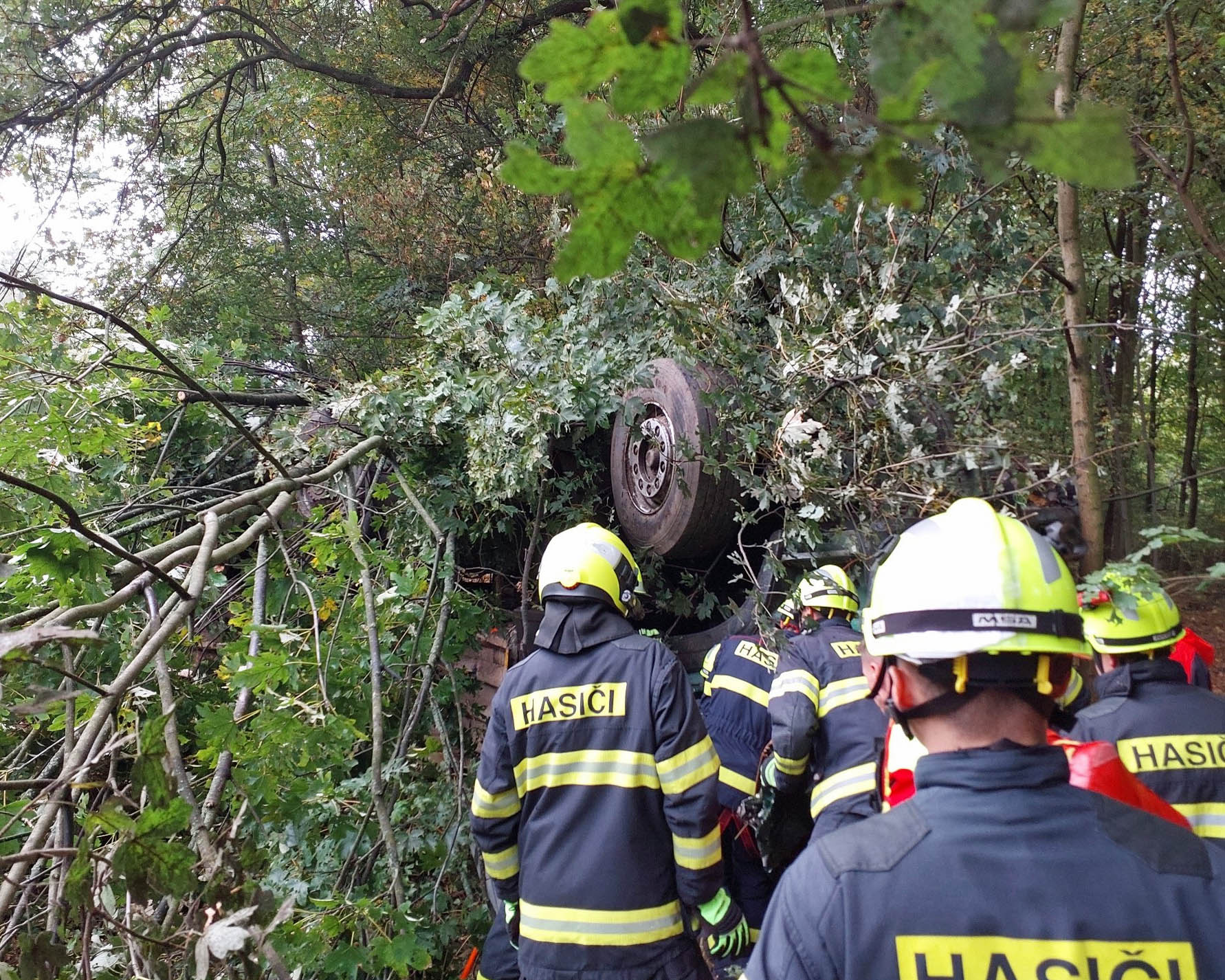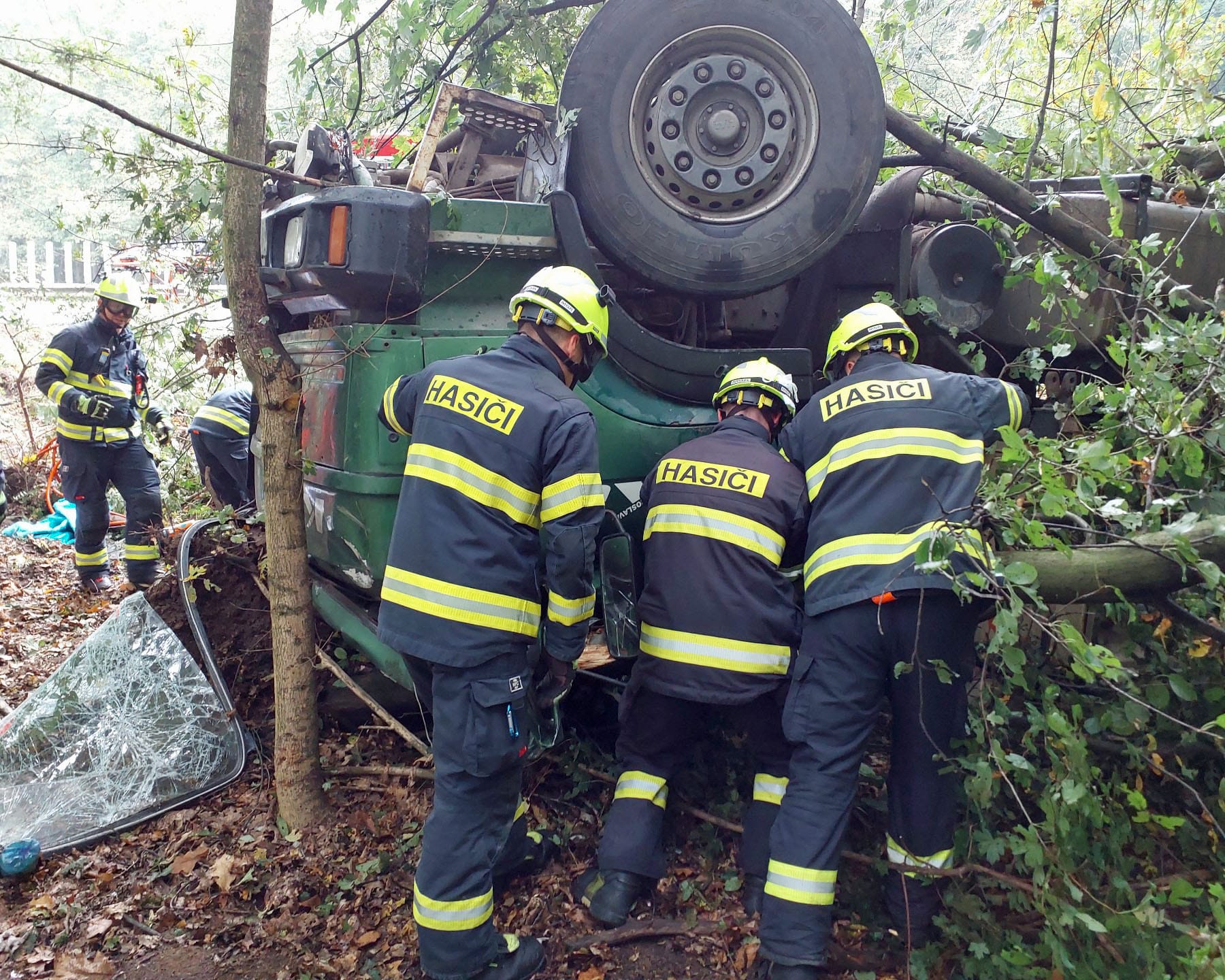 „Jednotka hasičů poté musela pomocí motorové pily rozřezat stromy, které se při nehodě zlomily a ležely na vozidle. Na pomoc byl povolán vyprošťovací automobil, kterým byl havarovaný nákladní vůz vyproštěn,“ uvedla Horáková s tím, že hasiči také zamezili úniku provozních náplní.