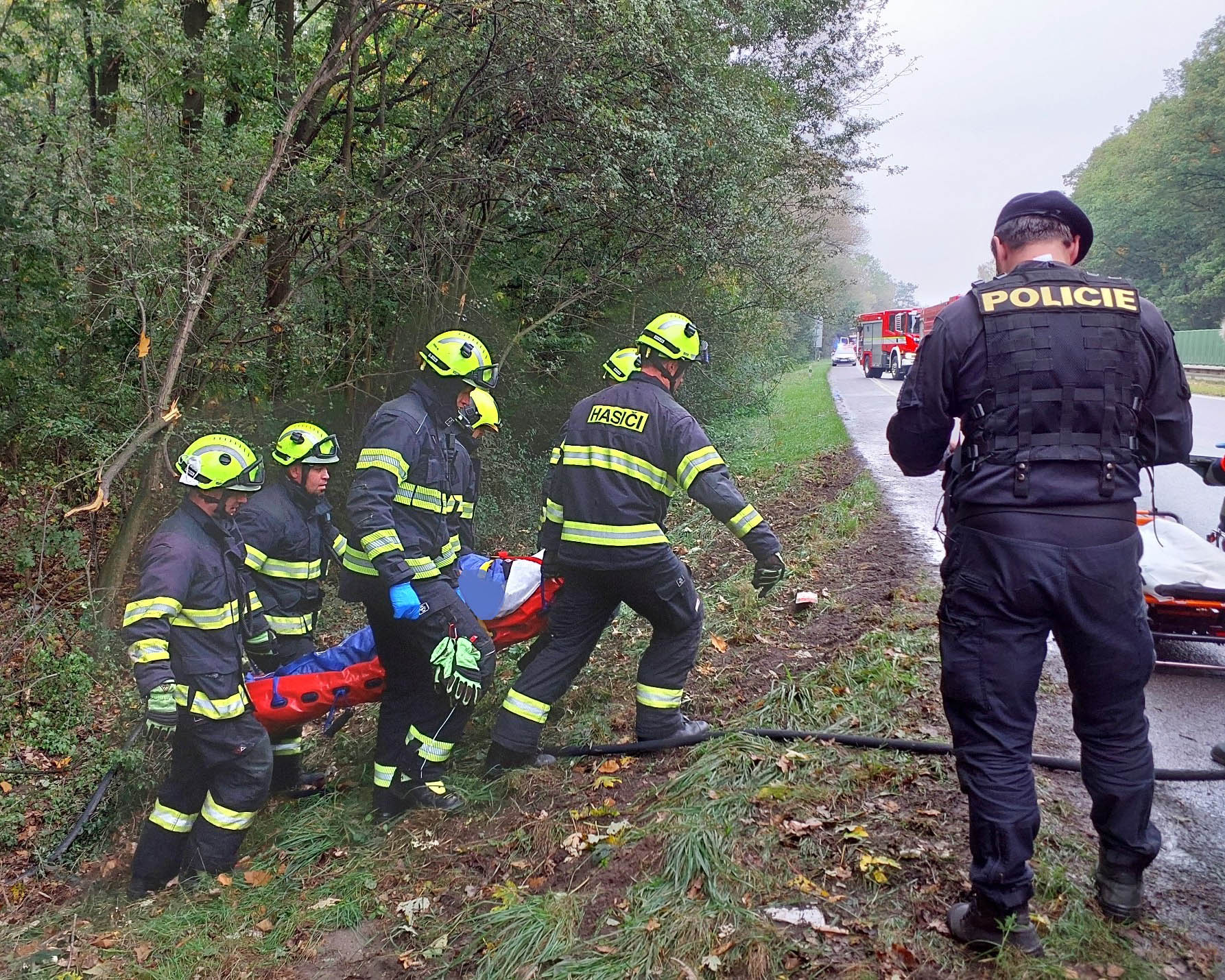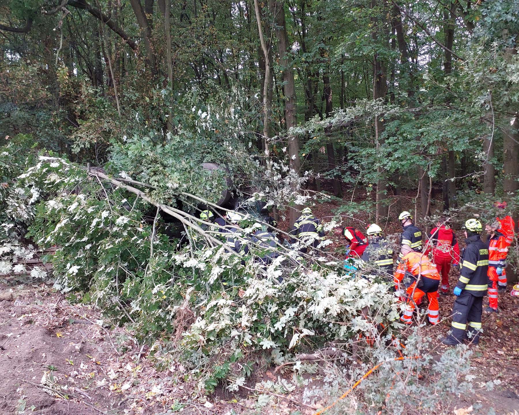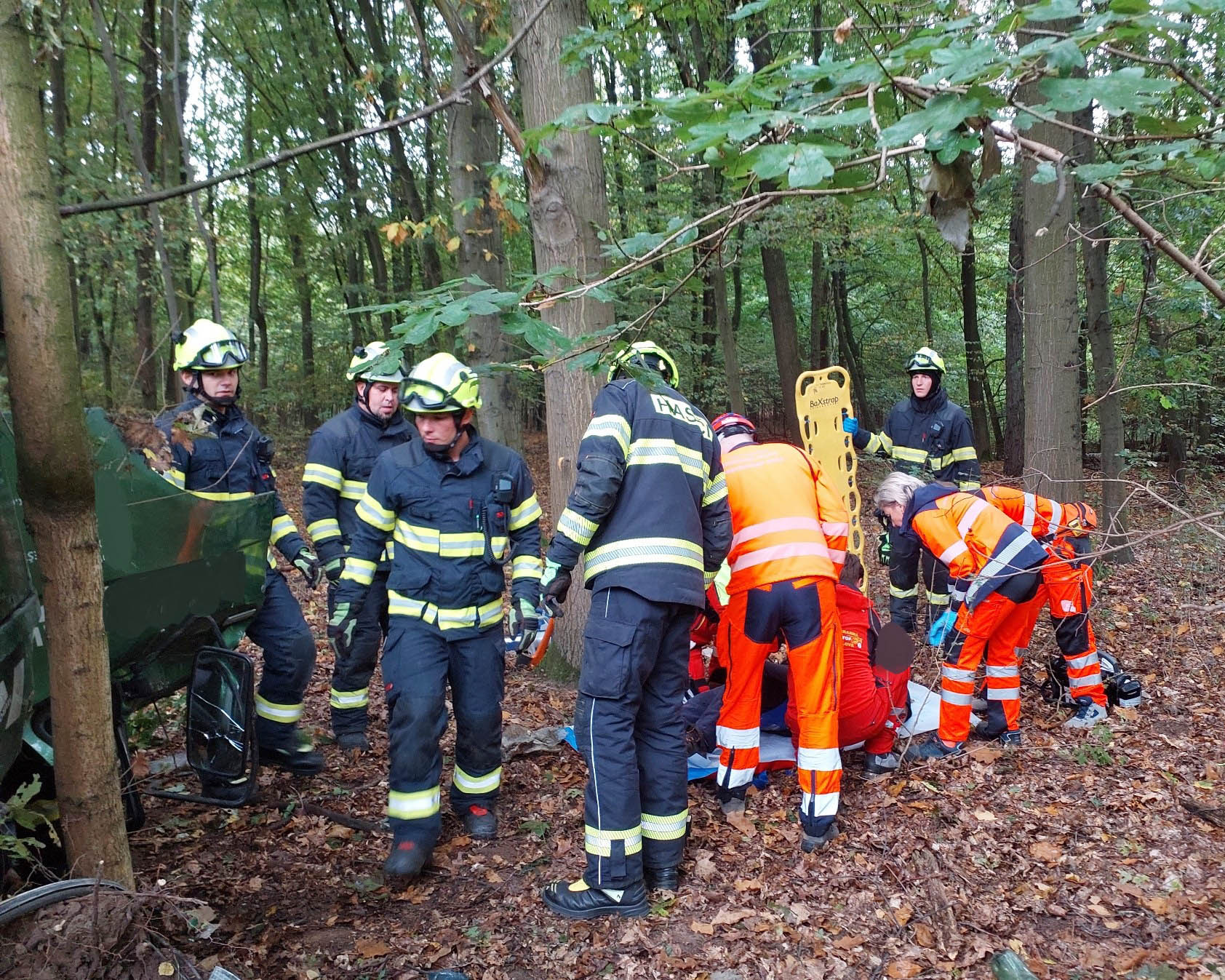 V kabině automobilu zůstal uvězněný řidič. „Hasiči po svém příjezdu museli vyprostit pomocí hydraulického vyprošťovacího zařízení řidiče ze zcela zdemolované kabiny. Muže hasiči po vyproštění přenesli na nosítkách z lesa k silnici, kde další hasiči připravili stanoviště k přistání vrtulníku letecké záchranné služby,“ informovala mluvčí HZS Pardubického kraje Vendula Horáková.