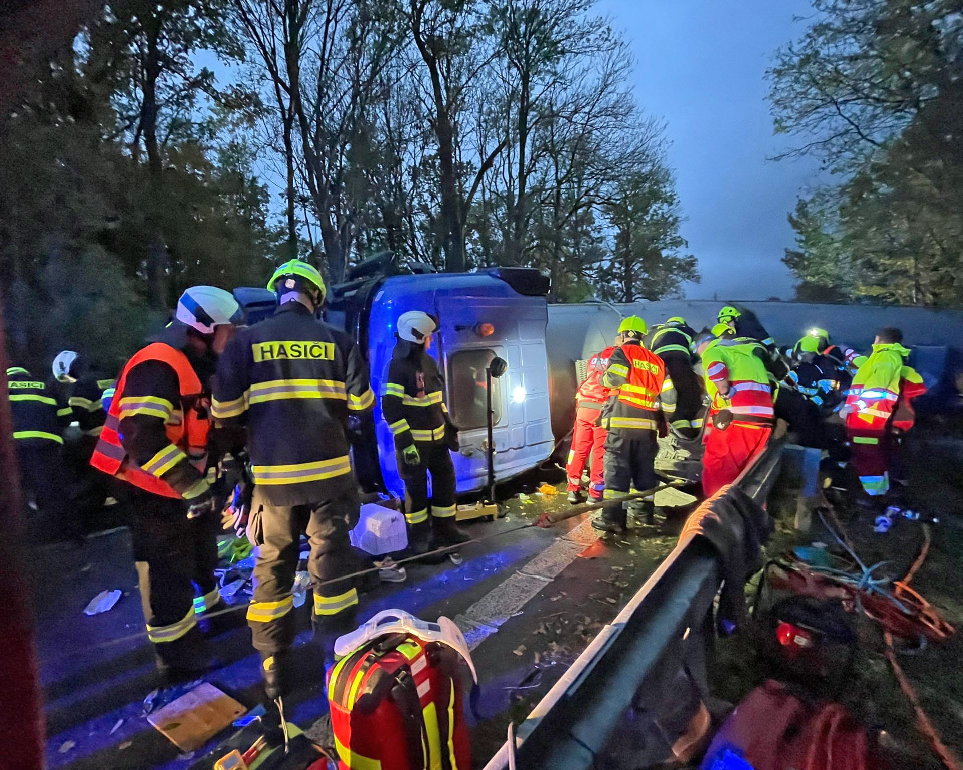 U nehody cisterny s chemikálií a tří osobních aut nakonec strávily jednotky hasičů 11 hodin. „Velmi náročné vyproštění zraněné osoby z vraku zmáčknutého pod návěsem, likvidační práce s ohledem na ochranu životního prostředí a nakonec převrácení tahače s návěsem,“ vyjmenoval rozsah prací mluvčí hasičů Zbyněk Voříšek.