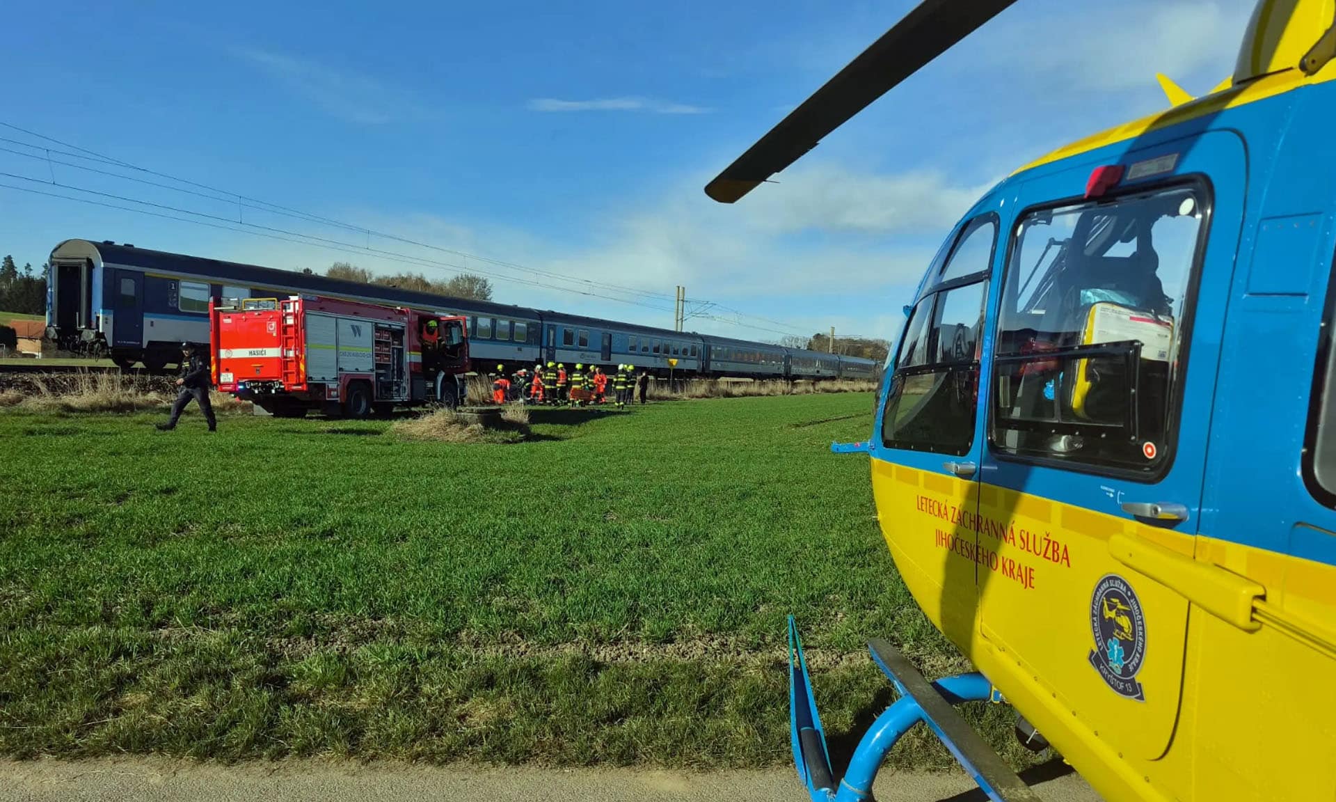 Kromě záchranky včetně vrtulníku Letecké záchranné služby na místě zasahovali také policisté a hasiči. Na místě jsou hasiči Správy železnic se svou technikou včetně jeřábu, profi hasiči z Českého Krumlova a dobrovolná jednotka Velešín.