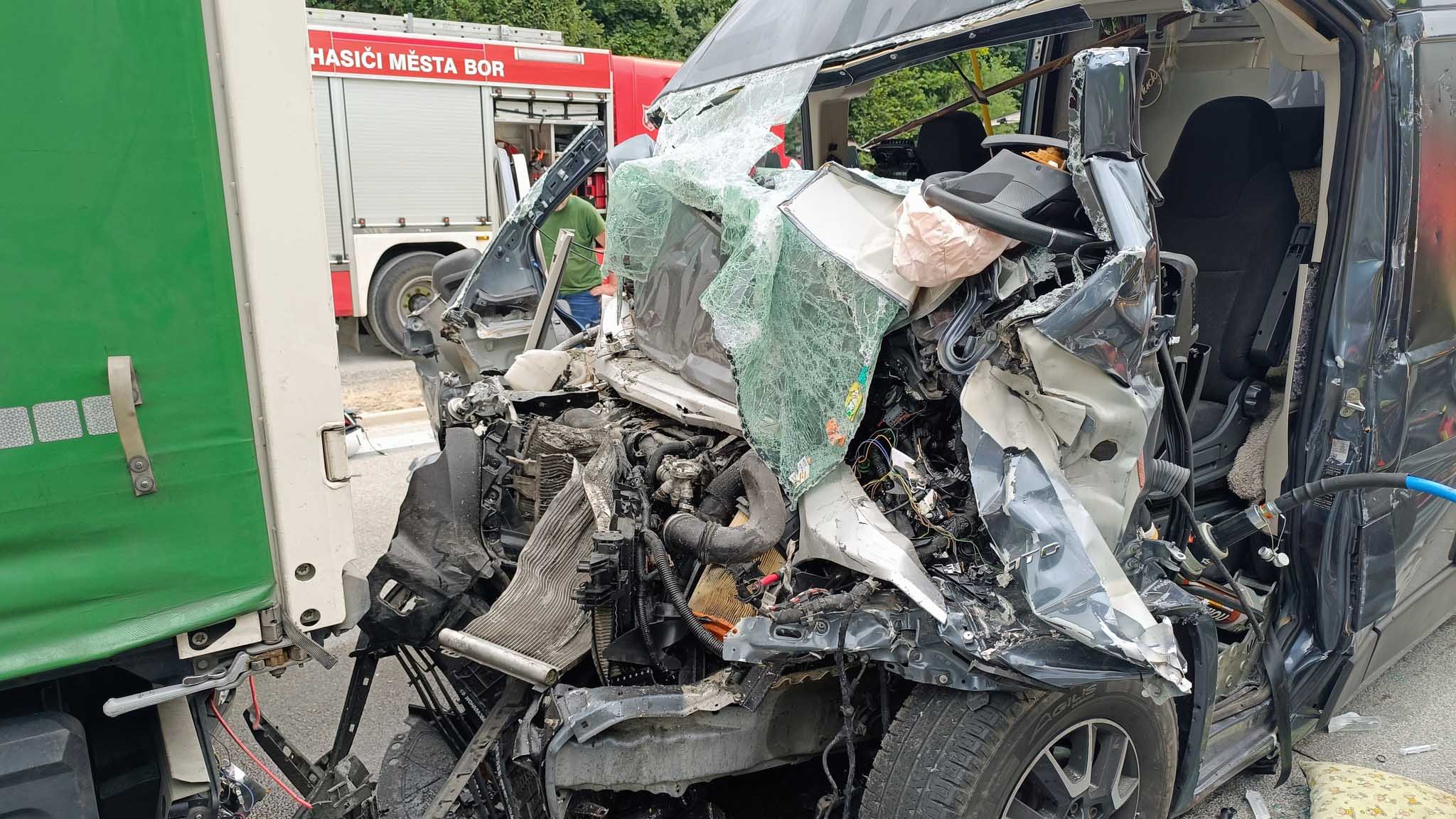 /Aktualizováno o nové fotografie/ Havárie se stala ve čtvrtek kolem 16. hodiny na dálnici D5 nedaleko Boru v místě, kde probíhá stavba a je tam tedy zúžení. Místem projížděla 60letá řidička z Německa v obytné dodávce a podle policie zřejmě nedodržela dostatečný rozestup od kamionu před sebou, nebo se nevěnovala řízení.