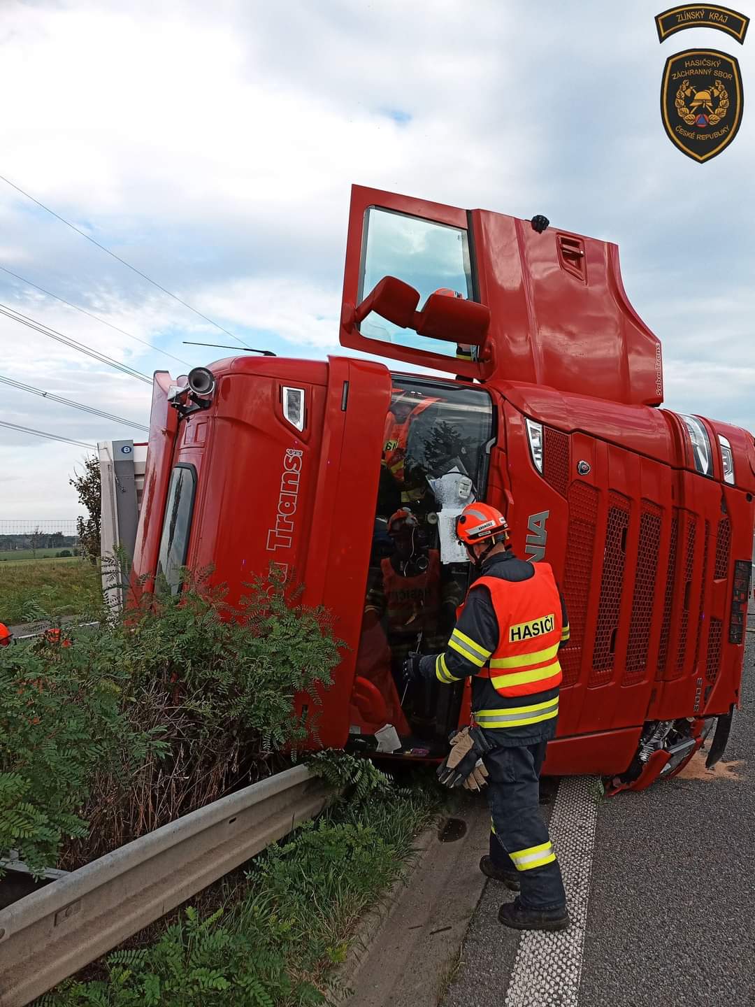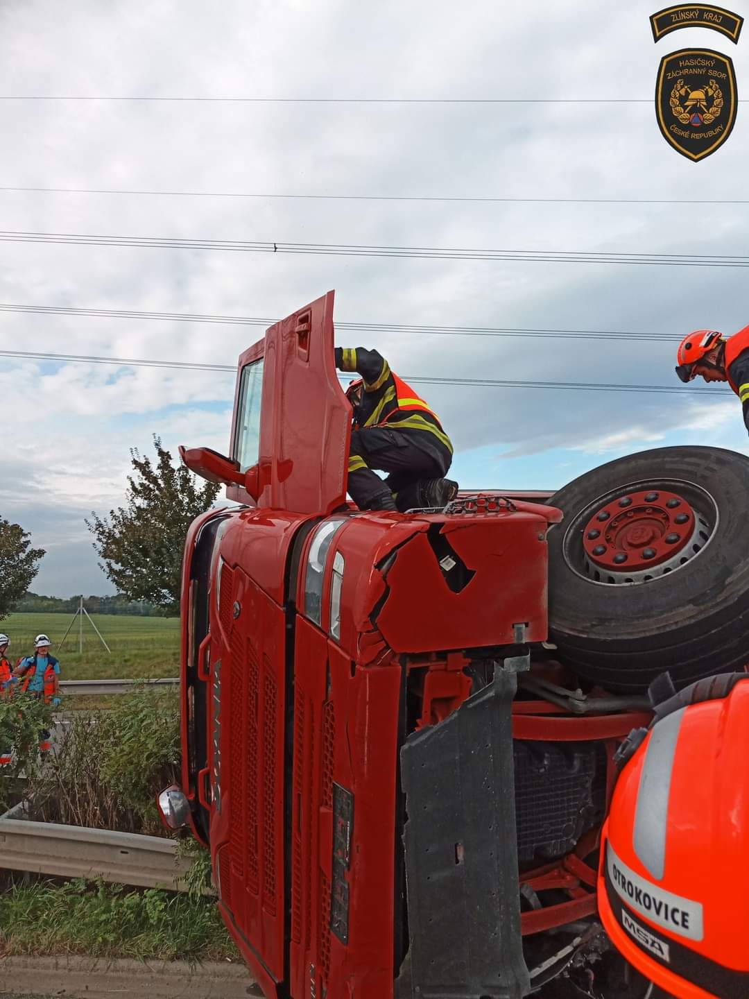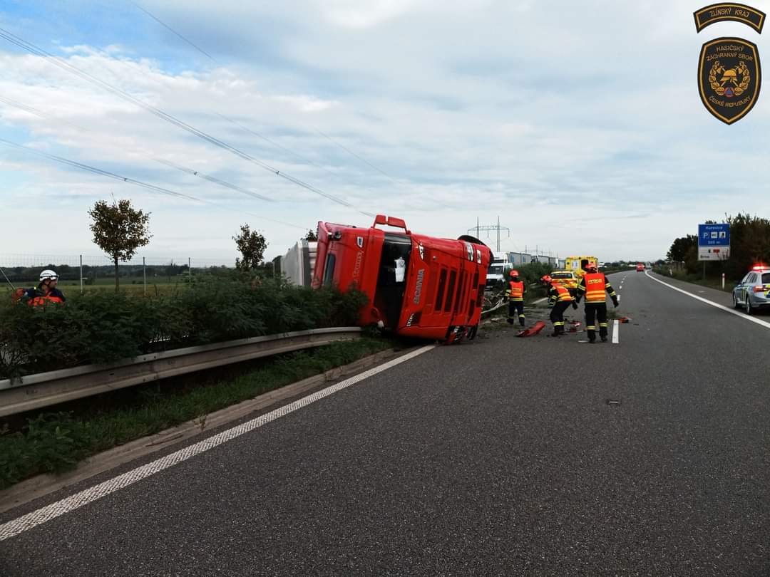 Nehoda se stala v úterý dopoledne na 22. kilometru dálnice D55 ve směru na Otrokovice poblíž odpočívky Kurovice. „Nákladní automobil je převrácený na bok a zasahoval přes středová svodidla,“ uvedl policejní mluvčí Radomír Šiška.