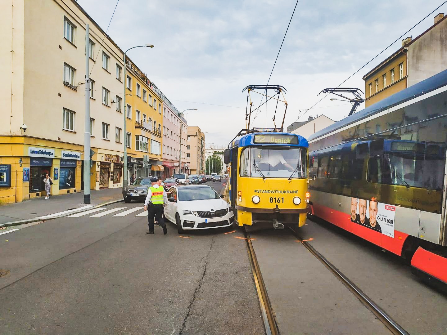 V Praze dnes do ulic vyjela tramvaj v ukrajinských barvách na podporu této válkou zkoušené země. Jenže hned první den měla kolizi s projíždějícím autem.