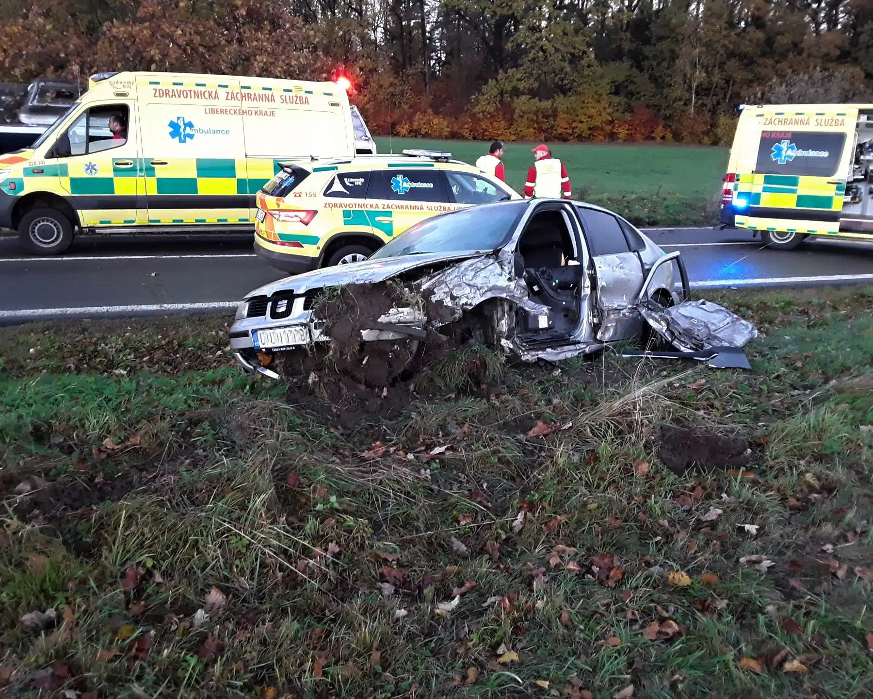 Autobus v příkopu, zdemolované osobní auto a navíc lehce nabouraný kamion. Tak skončila čtvrteční ranní nehoda na silnici 13 u obce Krásný Les na Liberecku. Podle prvních informací z policejního vyšetřování k nehodě došlo při předjíždění osobního auta.