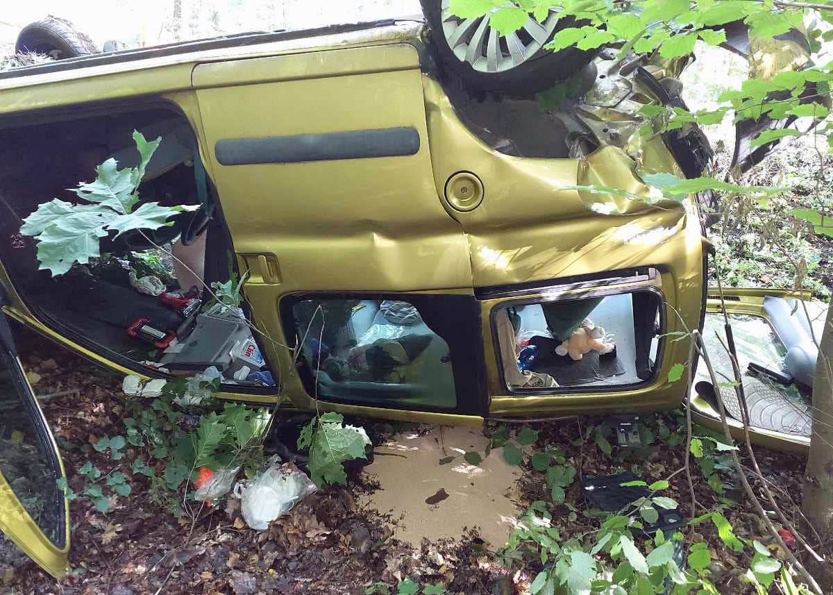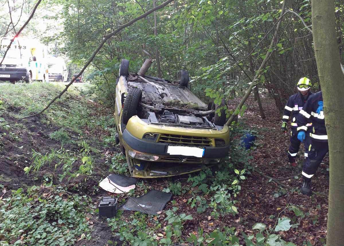 Vážná nehoda na Pardubicku: Citroën skončil v lese na střeše