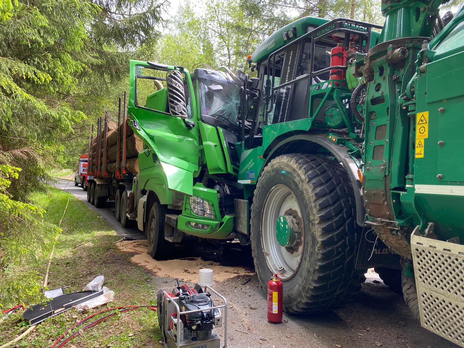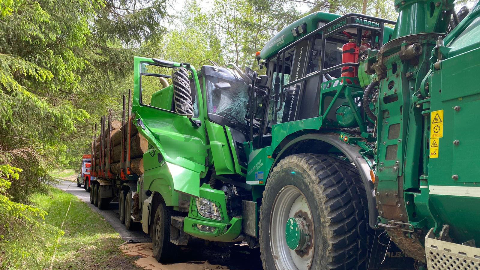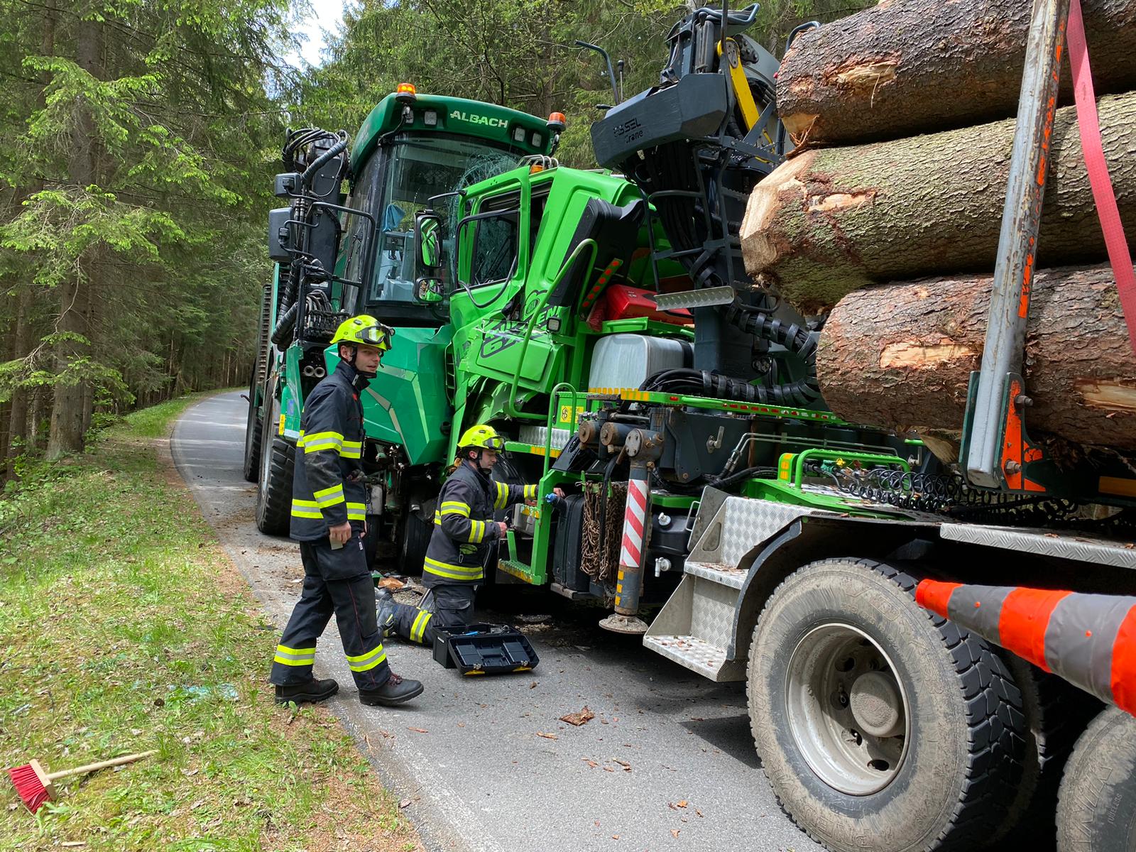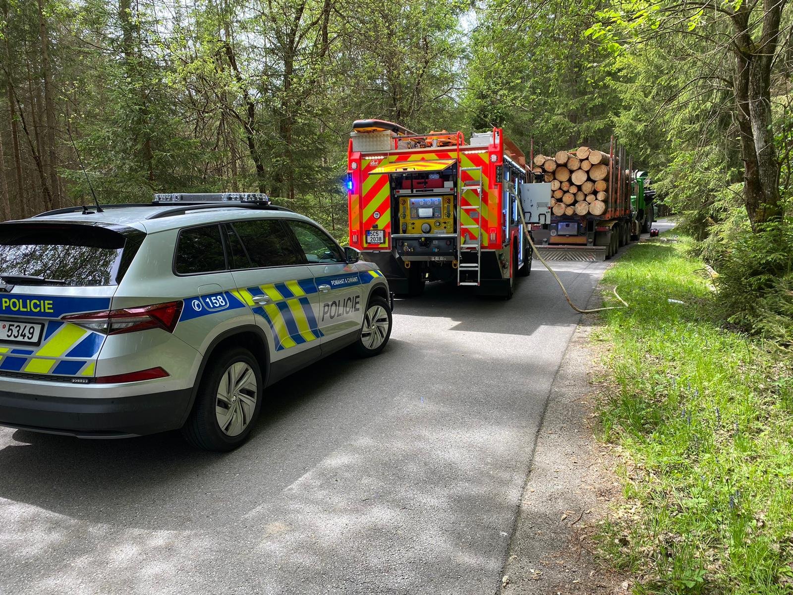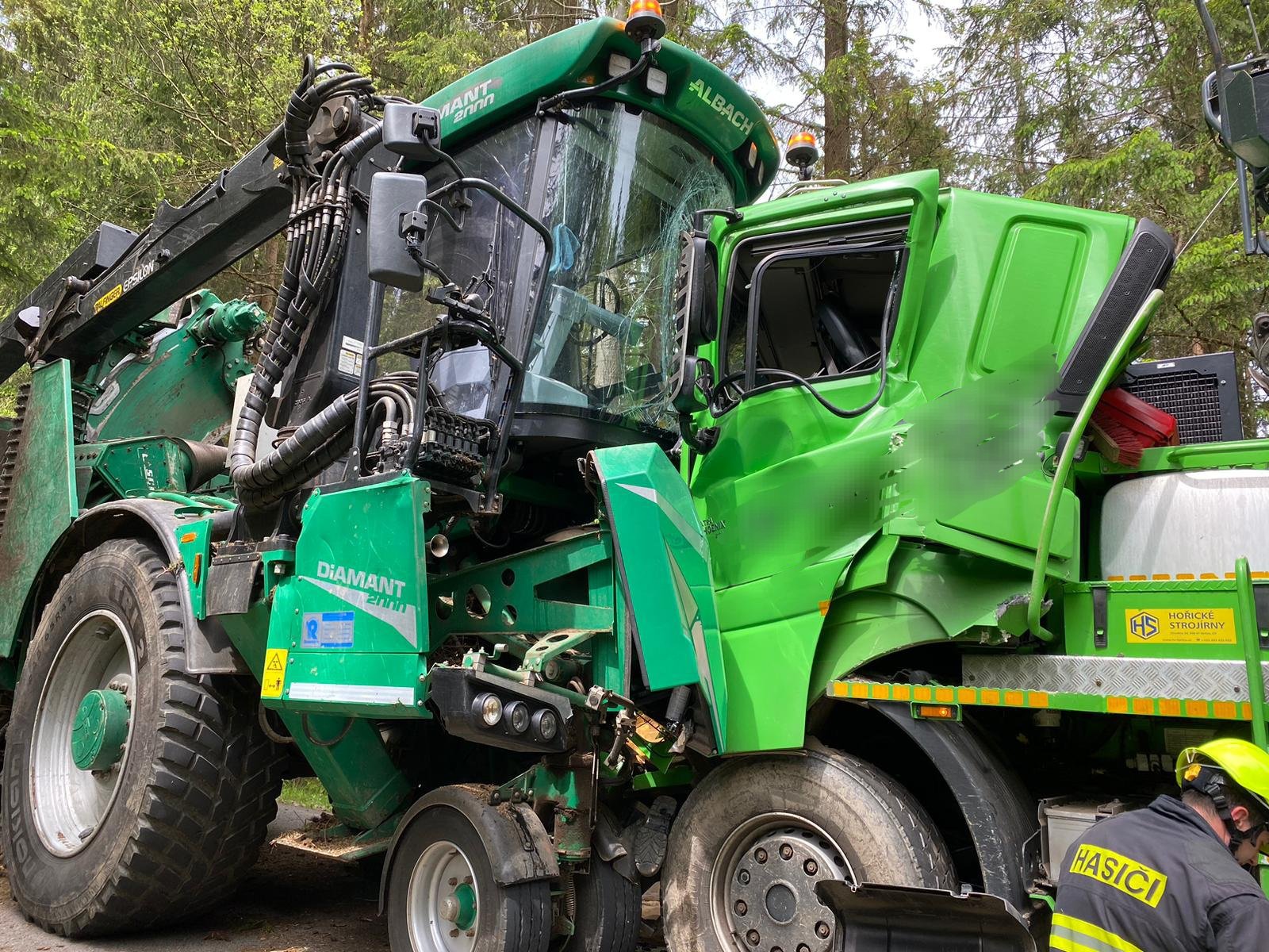 Poničená kabina a vážná zranění řidiče nákladního vozu. Tak skončila nehoda, při níž se na úzké silnici srazily dva kolosy – nákladní vůz naložený dřevěnými kmeny a stroj zvaný štěpkovač, který tvarem připomíná kombajn, ale slouží v lese k drcení větví.