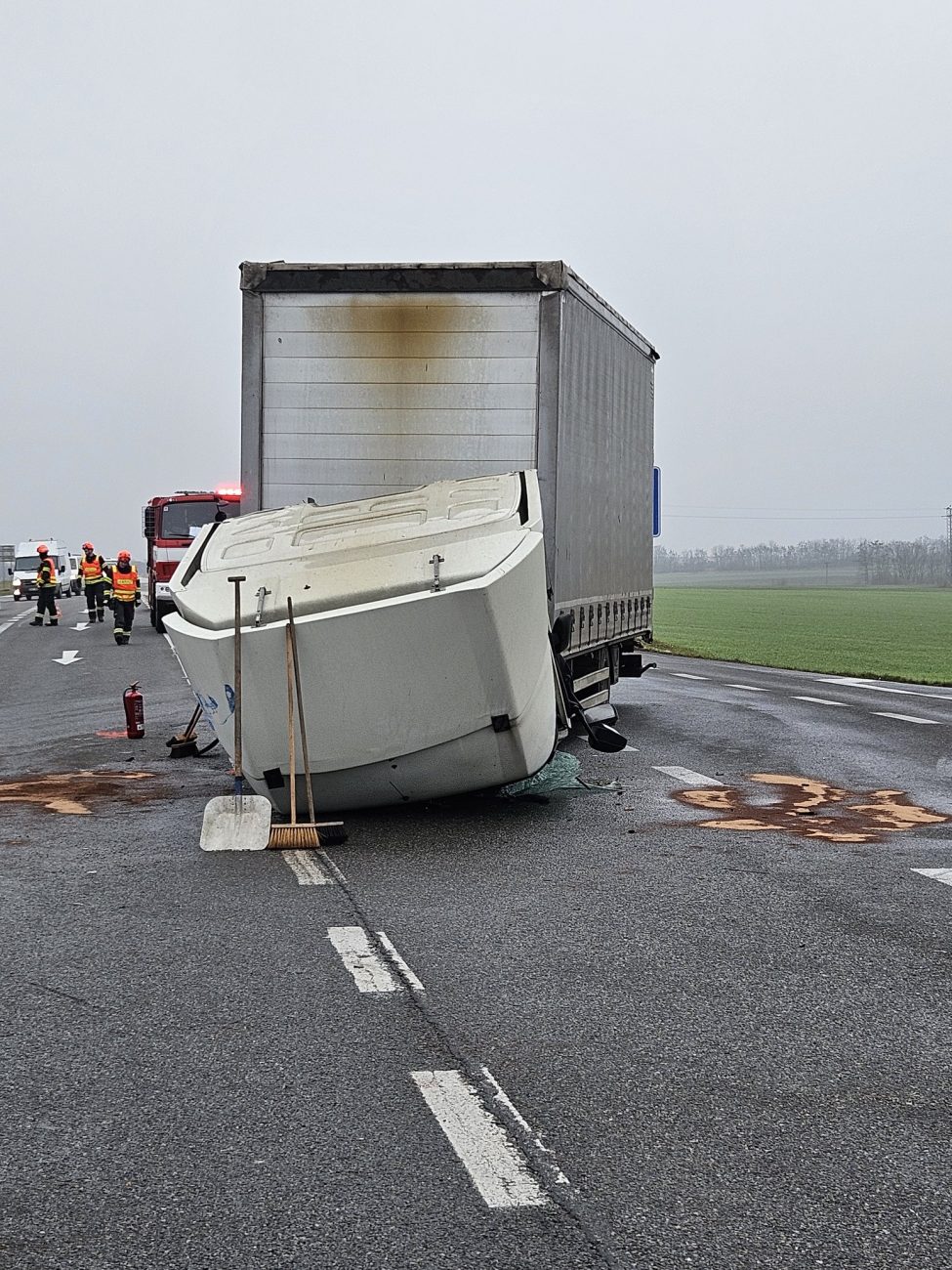 Jednomu z nákladních aut se po nárazu utrhla kabina, respektive se převrátila čelním sklem na silnici. Řidiče z kabiny museli vyprostit hasiči. „Jeden člověk byl předán do péče Zdravotnické záchranné službě,“ uvedli hasiči. Ti zajistili oba náklaďáky proti riziku požáru a zasypali uniklé provozní kapaliny na vozovce sorbentem.