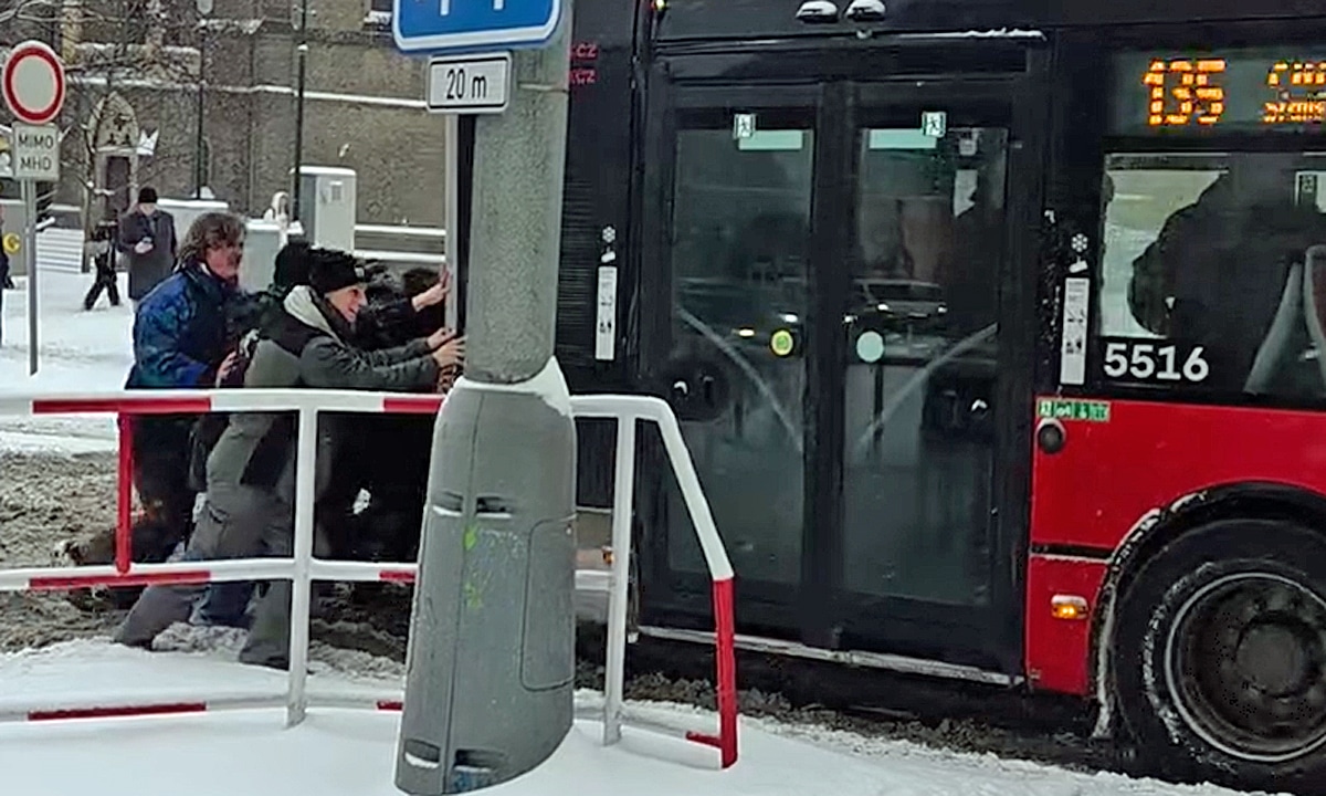 VIDEO: Cestující v Praze odtlačili autobus, který „zapadl“ ve sněhu. Video boří sítě