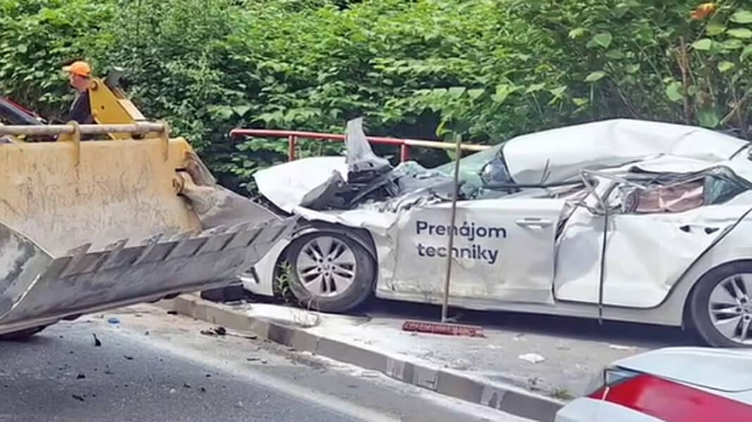 Velkou ránu od těžké „lžíce“ pracovního stroje dostala po srážce Škoda Octavia v Rosinské ulici v Žilině. Auto dostalo ránu na místo řidiče a skončilo téměř slisované na placku.