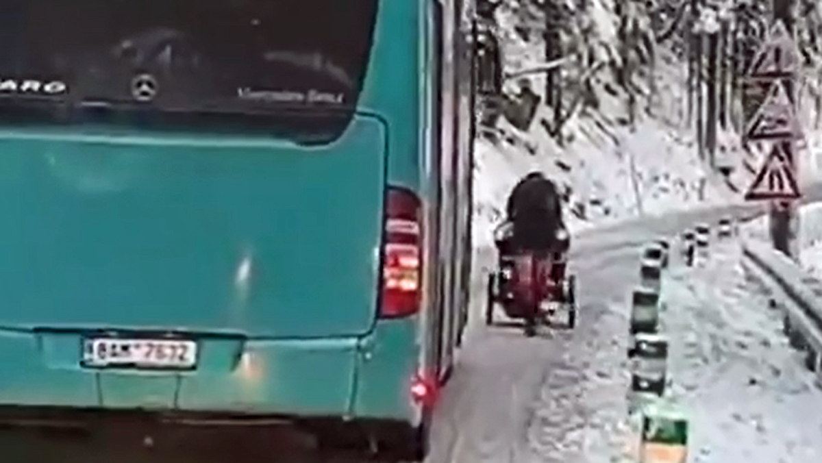 Řidič autobusu se jej na úzké cestě pochopitelně bál objet, protože silnice je i příčně svažitá a těžký vůz se může smeknout vpravo a člověka přimáčknout. Navíc na krajnici je vrstva sněhu.