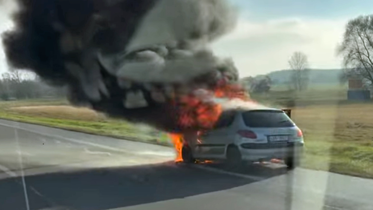 VIDEO: Na Pardubicku dnes za jízdy shořel benzinový Peugeot, plameny šlehaly z motoru
