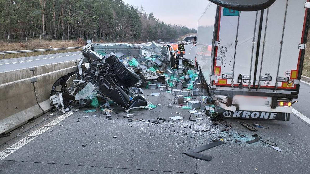 To mělo za důsledek, že náraz vůz v podstatě rozřízl na polovinu. Jeho trosky pak zůstaly rozeseté po dálnici stejně jako náklad. Bedny se z dodávky vyvalily rozpáraným bokem nákladového prostoru.