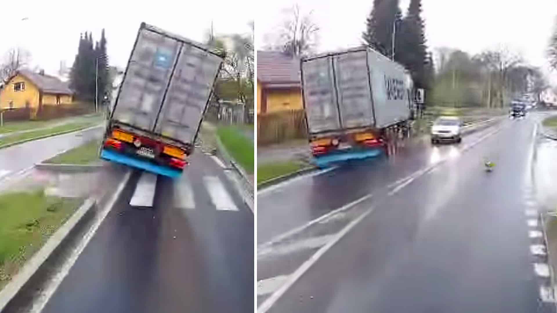 Událost zachytila kamera, na videu, které najdete pod článkem, je vidět kamion, jenž v pátek po poledni projíždí po silnici I/21 mezi Mariánskými Lázněmi a Chebem. V obci Stará Voda si zřejmě nevšiml blížícího se ostrůvku na silnici, najel na něj levými koly a toho stáhlo do protisměru, kde zrovna přijíždí osobní vůz stříbrné barvy, zřejmě starší Škoda Fabia.