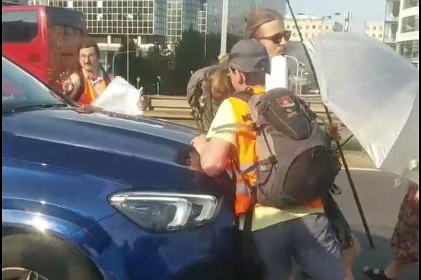 Vůz před sebou tlačí demonstranty blokující dopravu. Video: Poslední generace