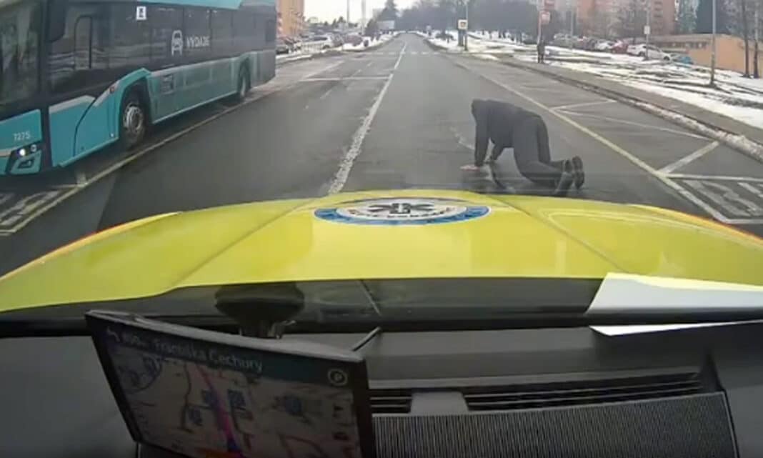 Před rozběhnutým chodcem pak museli zdravotníci prudce brzdit a byli vystavení velmi rizikové situaci. Chodec navíc ztratil rovnováhu a spadl před auto na silnici. Přitom se viditelně uhodil do obličeje. Naštěstí ale řidič záchranky zvládl zastavit a nestalo se neštěstí. Chodec se zvednul, mávnul a pokračoval na autobus.