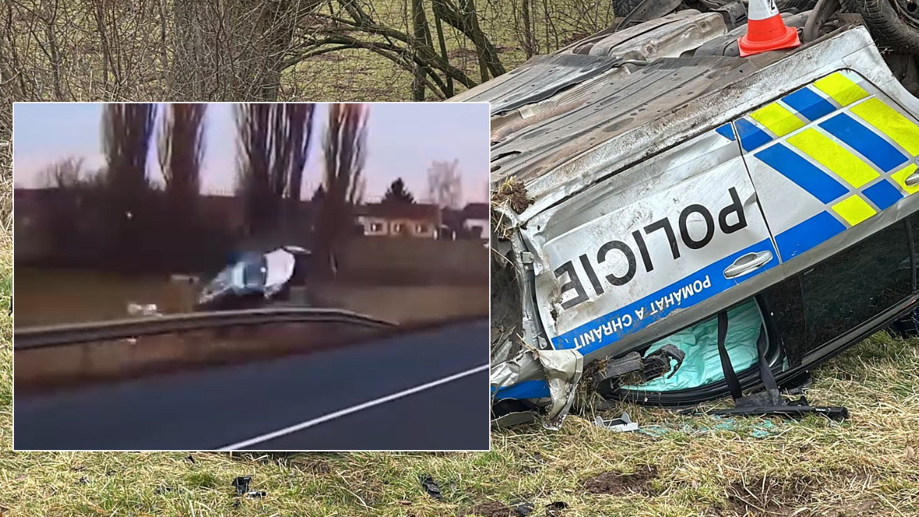 Auto policie bylo po silném nárazu odraženo vpravo mimo silnici, kde se několikrát převrátilo, doslova letělo po travnaté ploše a stále se převracelo, až skončilo otočené na střeše. Bylo obrovské štěstí, že tam nikde nebyl strom, nebo sloup. Pak mohly být následky fatální.