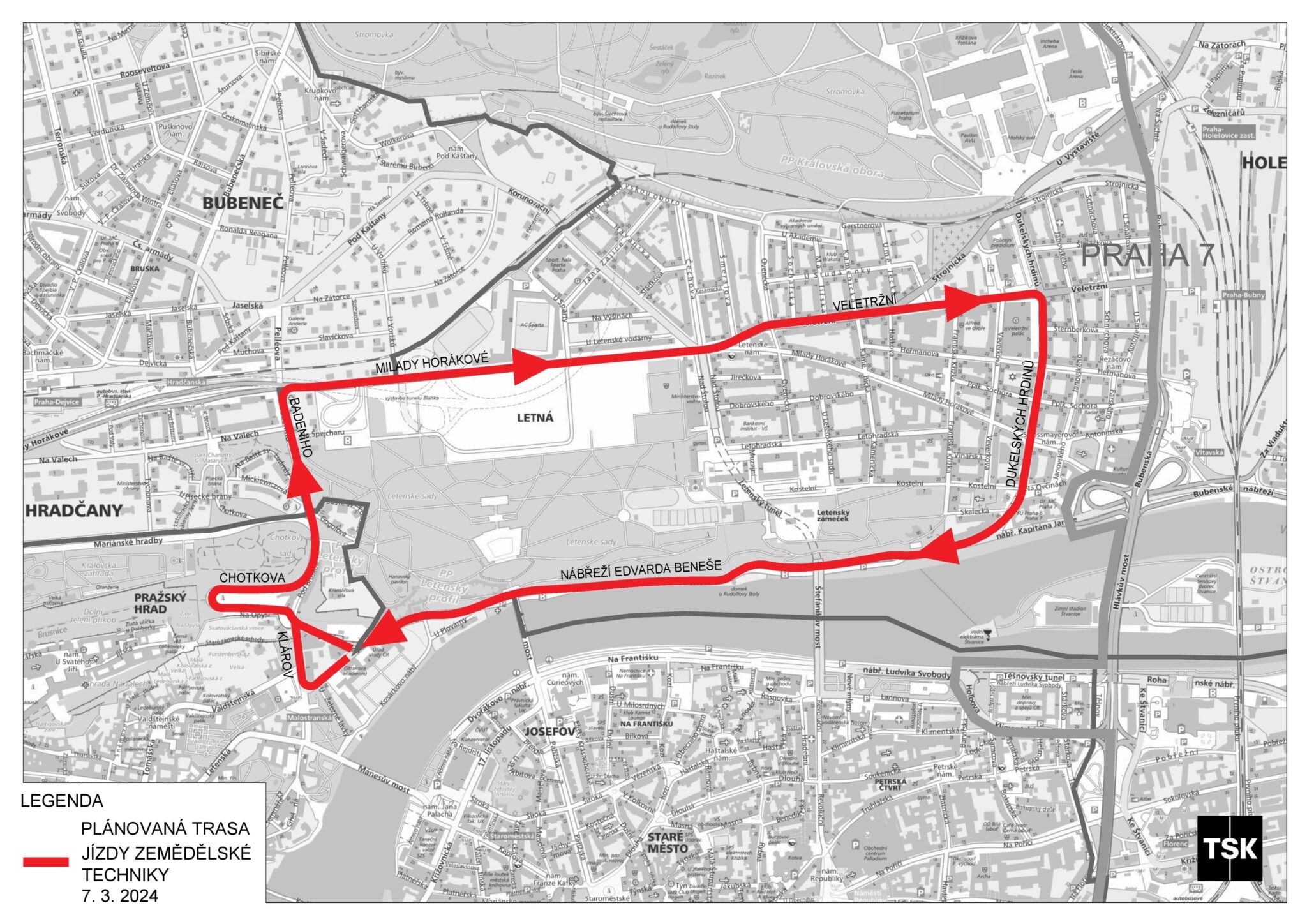 Policie už včera varovala před nájezdem techniky okolo sedmé hodiny ráno na Letenskou pláň. Celý den se pak očekávají dopravní komplikace v centru Prahy, okolo Letenských sadů a Úřadu vlády ČR. Řidiči by se proto měli centru vyhnout. V okolí Letné se může zpožďovat i městská hromadná doprava.